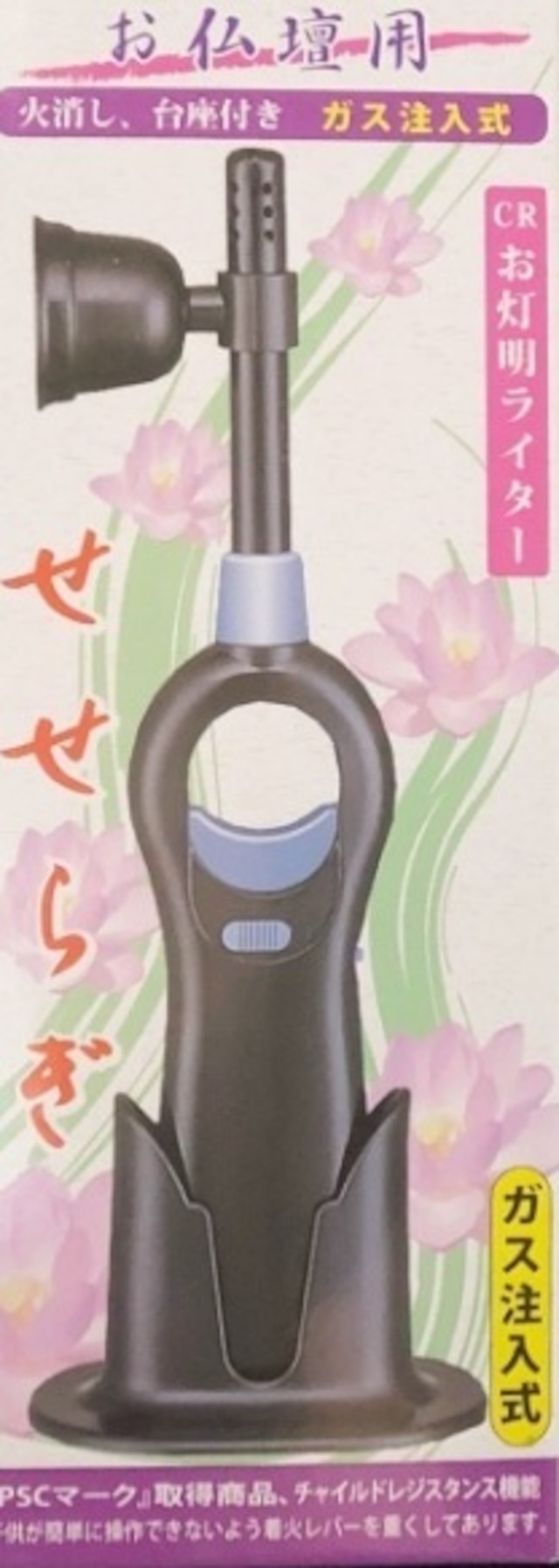 火消し・台座付き! お仏壇用ガス注入式お灯明ライター「せせらぎ」です。 台座付きなので置く場所を選ばずに使えます。 ガス注入式ですので、ガスを補充すれば何度でもご使用可能! ON、OFF切り替えの安全スイッチが付いていますので、 移動の時や保管時、ご使用しない時の誤操作を防ぎます。 ボタンを強く押さないと着火できない「ハードプッシュ着火方式」。 小さなお子様によるいたずらによる事故、けがを防止する為に、小さなお子さんが簡単に使えないように経済産業省が定めたCR(チャイルドレジスタンス)規制を基に作られております。 【商品詳細】 形状:注入式ガスマッチ 着火方式:電子式 燃料タイプ:ブタンガス注入式 PSCマーク付 本体サイズ 70×58×192㎜ 単品サイズ 72×61×196㎜/78g 内箱サイズ 310×150×200㎜/1.1㎏ 外箱サイズ 625×520×315㎜/12㎏